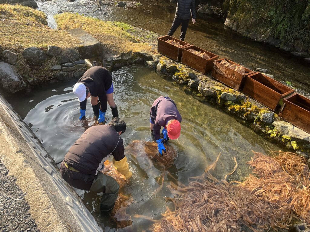今年 最初の川晒し 2026 1/19 日誌 2026年1月19日 箔合紙(はくあいし)は、三椏を釜炊き後 1晩 川に晒し、翌朝上げます。地元小学5年生 14名が、手伝いに来てくれました。冷たいのに 🥶 素足に長靴 素手でやる子も…若さは羨ましい。お疲れ様でした😊 日誌 よかったらシェアしてね! URLをコピーしました! URLをコピーしました! 今年最初の窯炊き